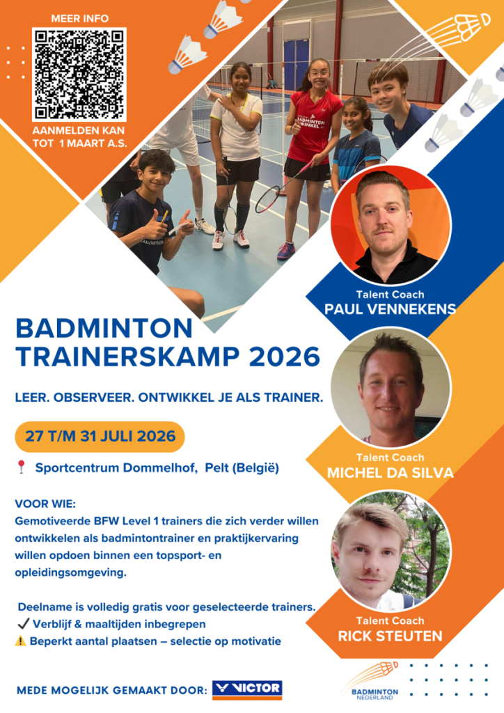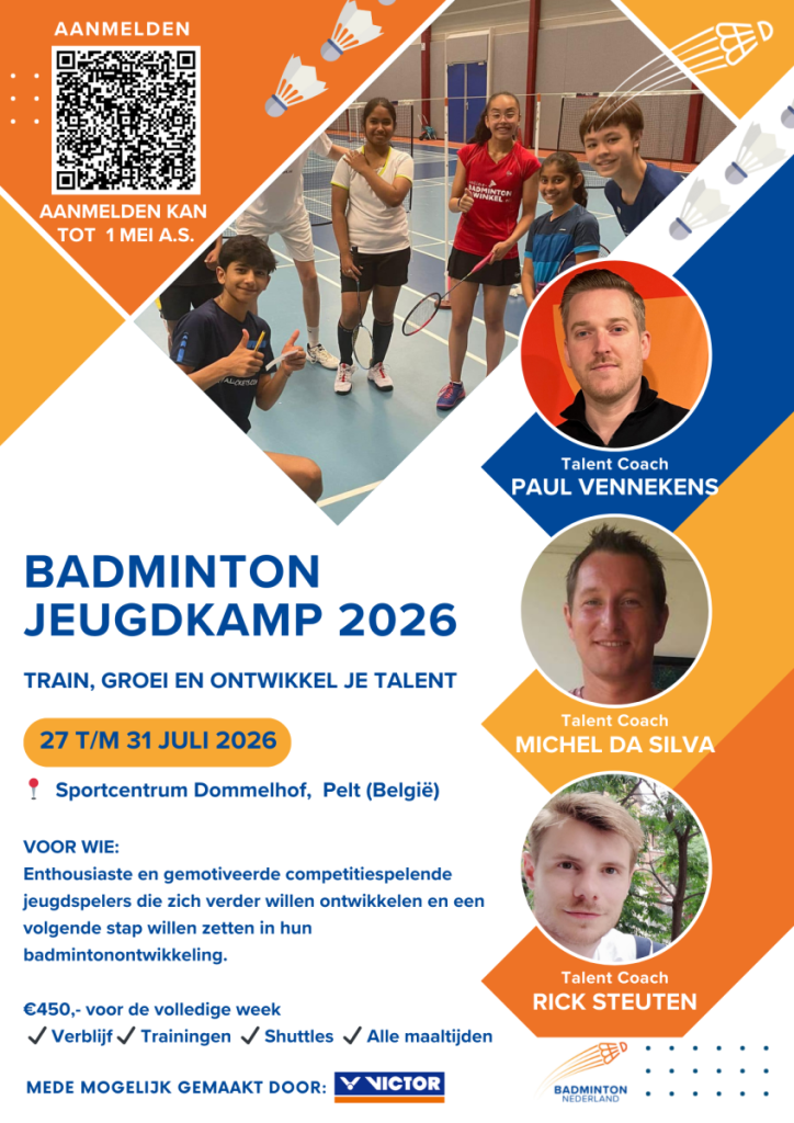 Badminton Nederland organiseert deze zomer het Badminton Jeugdkamp 2026. Van 27 t/m 31 juli 2026 staat Sportcentrum Dommelhof in Pelt (België) volledig in het teken van talentontwikkeling, voor zowel jeugdspelers als trainers.